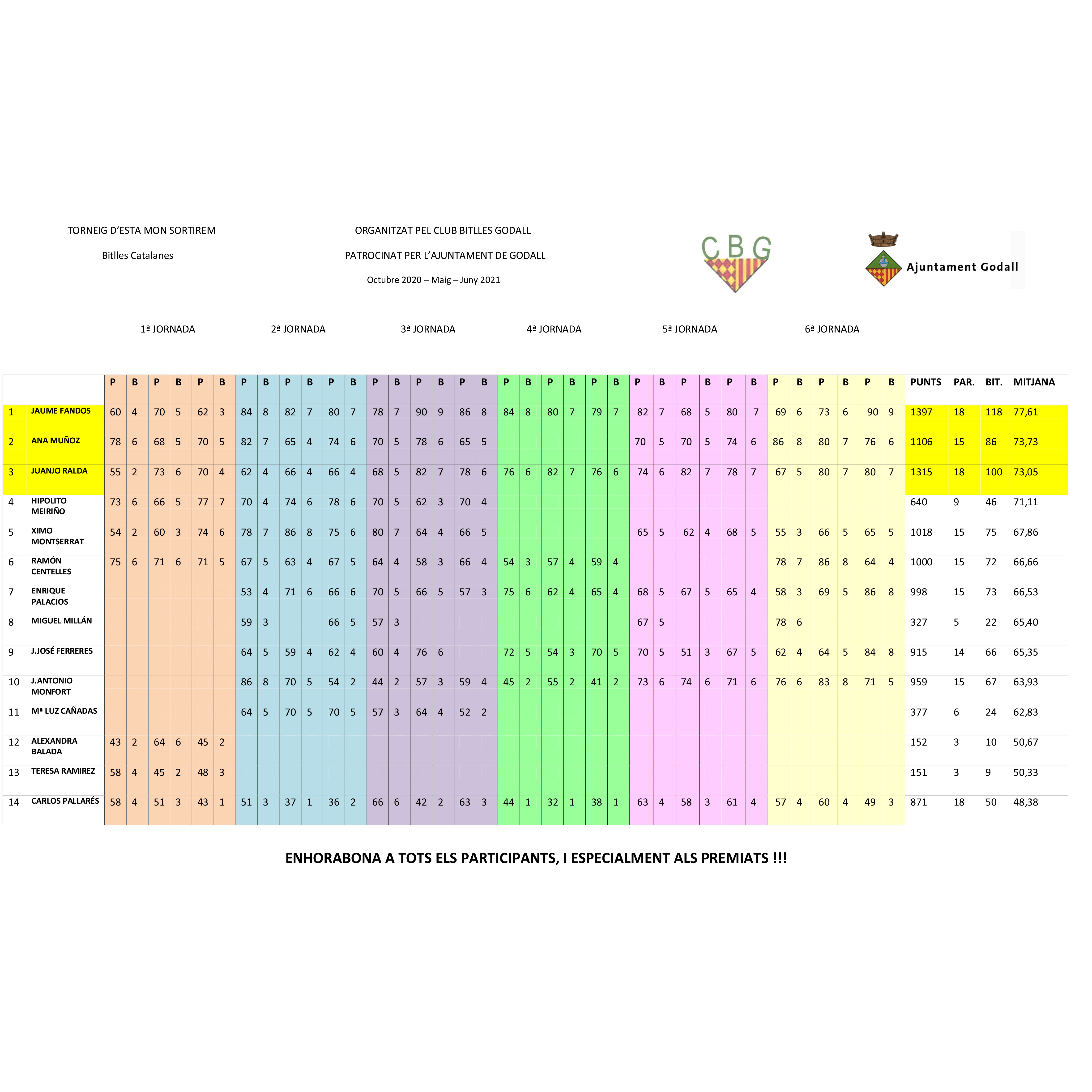 L’Ajuntament de Godall vol agrair al Club de Bitlles la magnífica organització d’aquest Torneig tenint en compte totes les dificultats que ha comportat.
